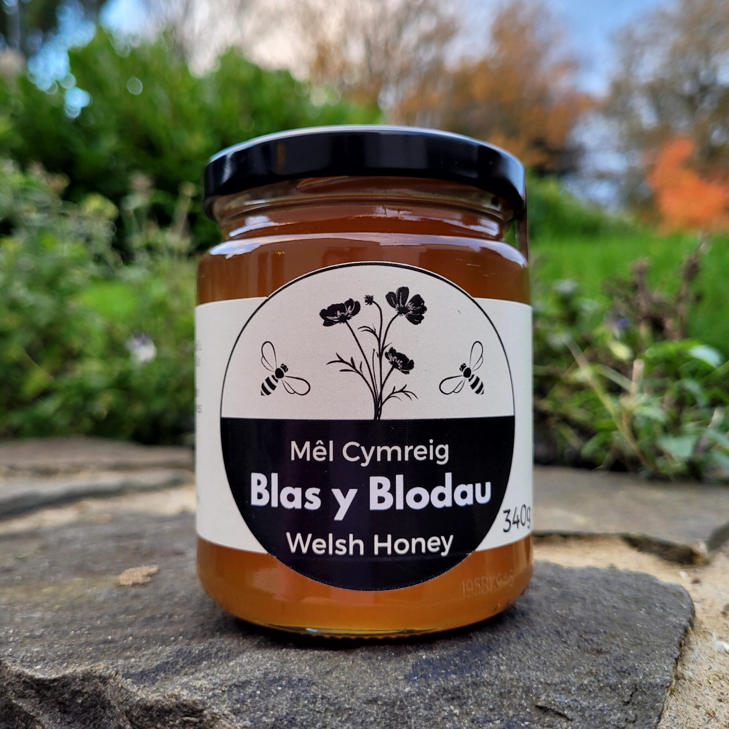 Blas y Blodau gan wenyn Cymreig wedi’u cadw gan fusnes bach teuluol yn Sir Gâr.