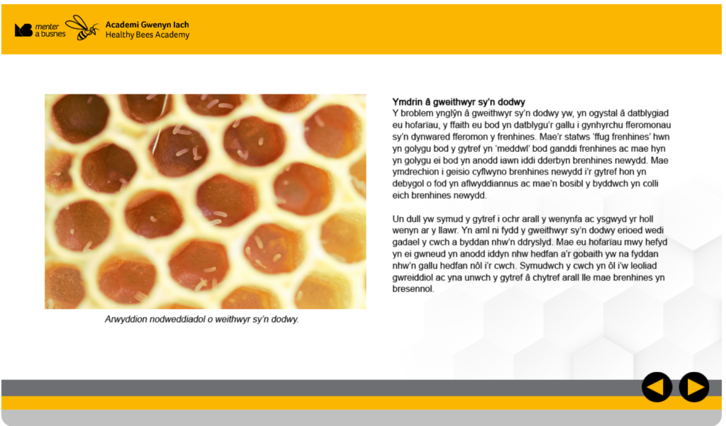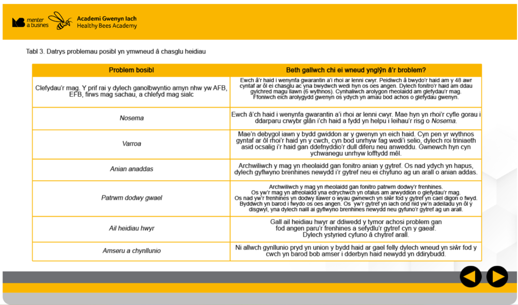 Yn ei hanfod mae’r academi yn gyfuniad o ddiagramau, lluniau, podlediadau a fideos sy’n cyflwyno gwybodaeth ddefnyddiol mewn sawl fformat hawdd ei ddilyn. Un peth roeddwn yn ei fwynhau yn fawr oedd y rhestrau wirio i adnabod problemau a’u taclo – ac mae modd lawrlwytho’r taflenni hyn ar ffurf pdf – sy’n grêt, gan nad oes signal ffôn yn y Wenynfa yn aml – heb sôn am drochi’r ffôn llawn mêl!