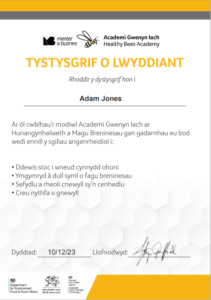 Rwyf wedi cael cyfle erbyn hyn i gwblhau modiwlau’r Academi Gwenyn Iach sydd wedi’i greu gan Menter a Busnes i helpu gwenynwyr i wella iechyd a chynhyrchiant ein cychod gwenyn.