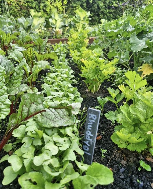 Dyma’r gwely saladau yn llawn sbigoglys, letys, selari, cêl bach, kohlrabi a rhuddygl.